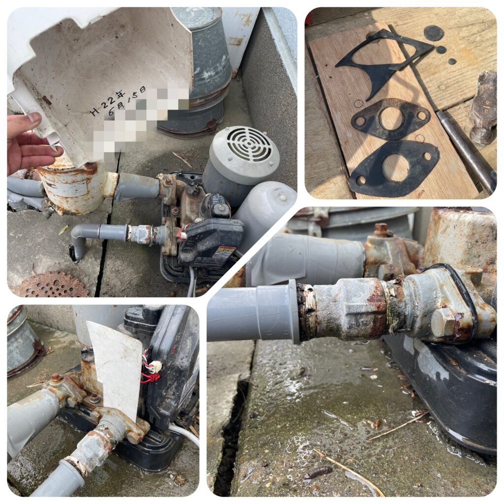 原因は究明できたので復旧させようとしたところ、腐食気味の配管ネジ部とフランジ接続部から水漏れするようになってしまいました。