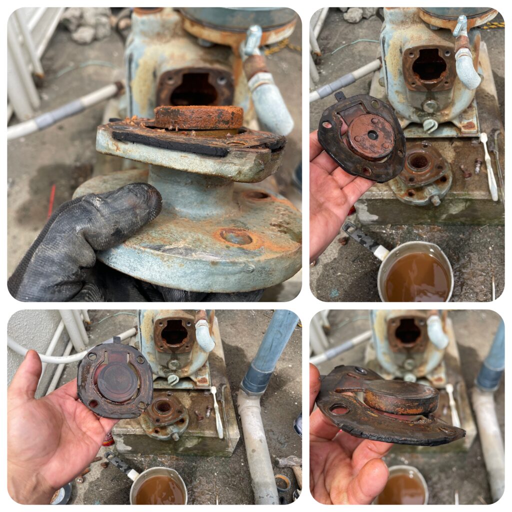 外す前までは調子良く汲み上げ出来ていたポンプですが、一旦休眠させてしまうとゴムパッキン類が大気に触れ乾燥してひび割れてしまい使えなくなることはよくあります。