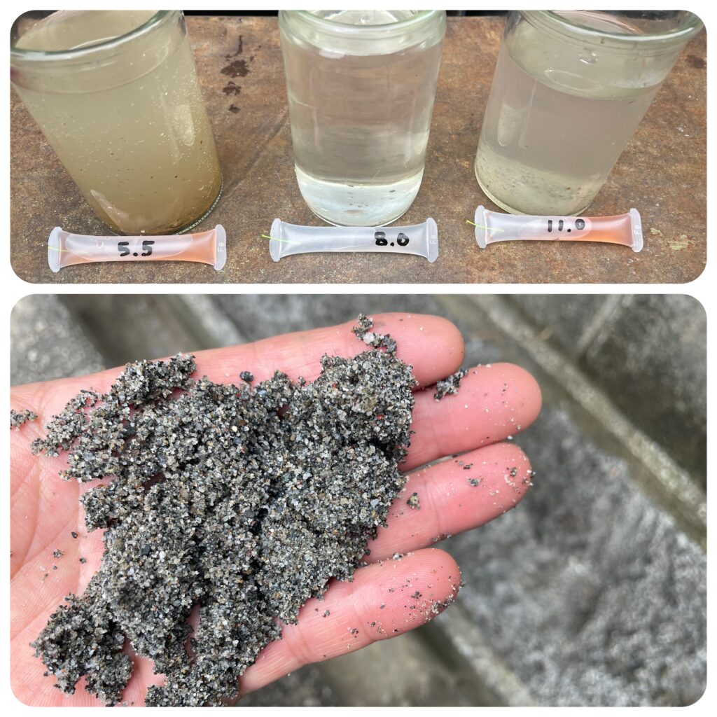 5.5mと11mの深さでは鉄分を多く含む水質でしたので8mまで抜き上げて探りを入れたところ、今度は砂の排出が多くなってしまいました。