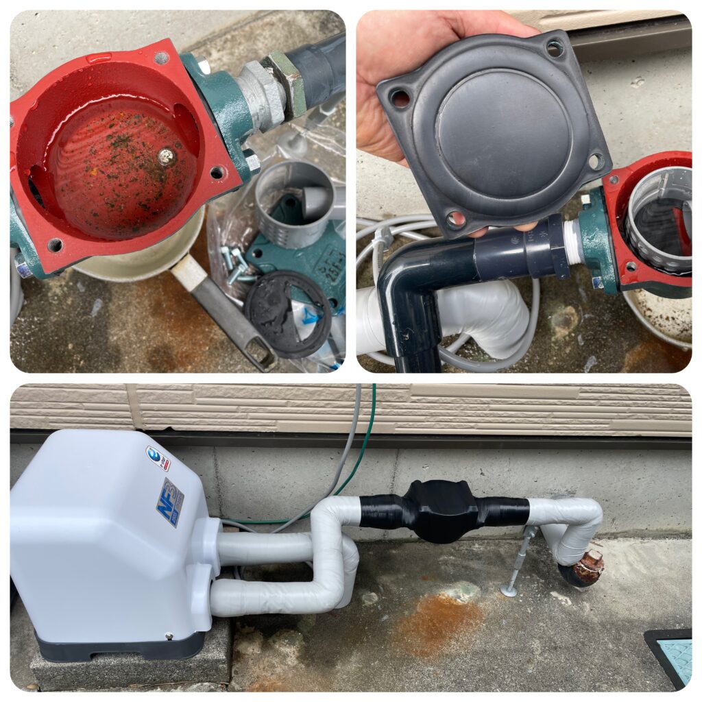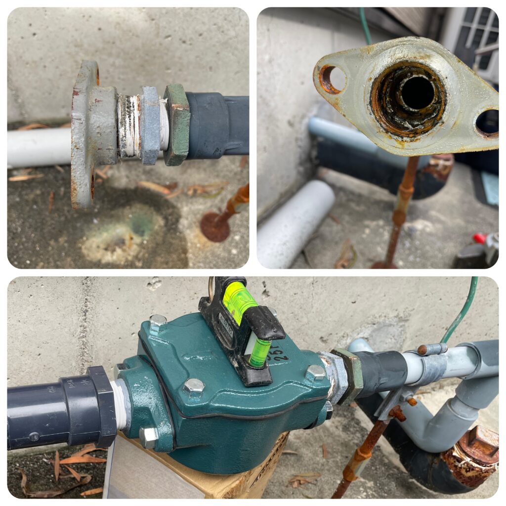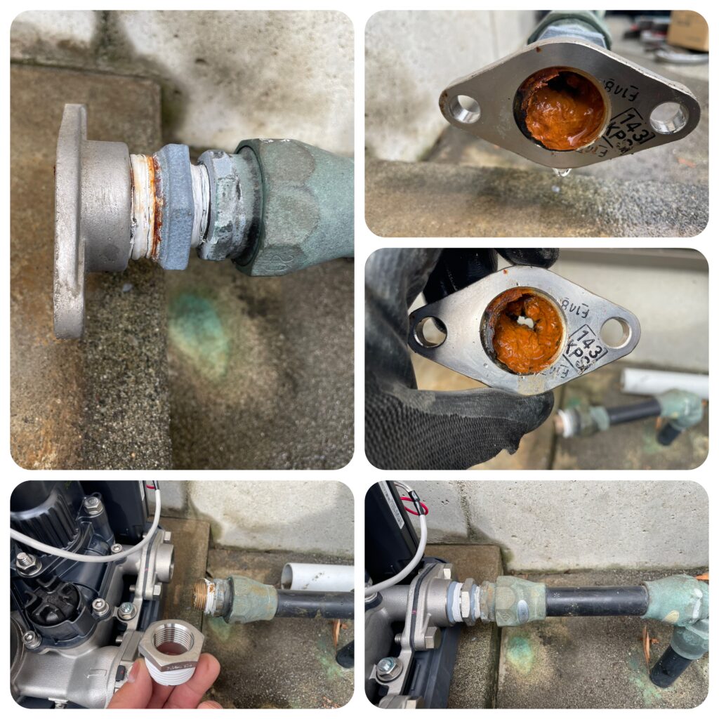 前任者がステンレス製のポンプに鉄製の継手を使用してしまっていて、イオン化傾向で鉄が腐食して管が閉塞していました。