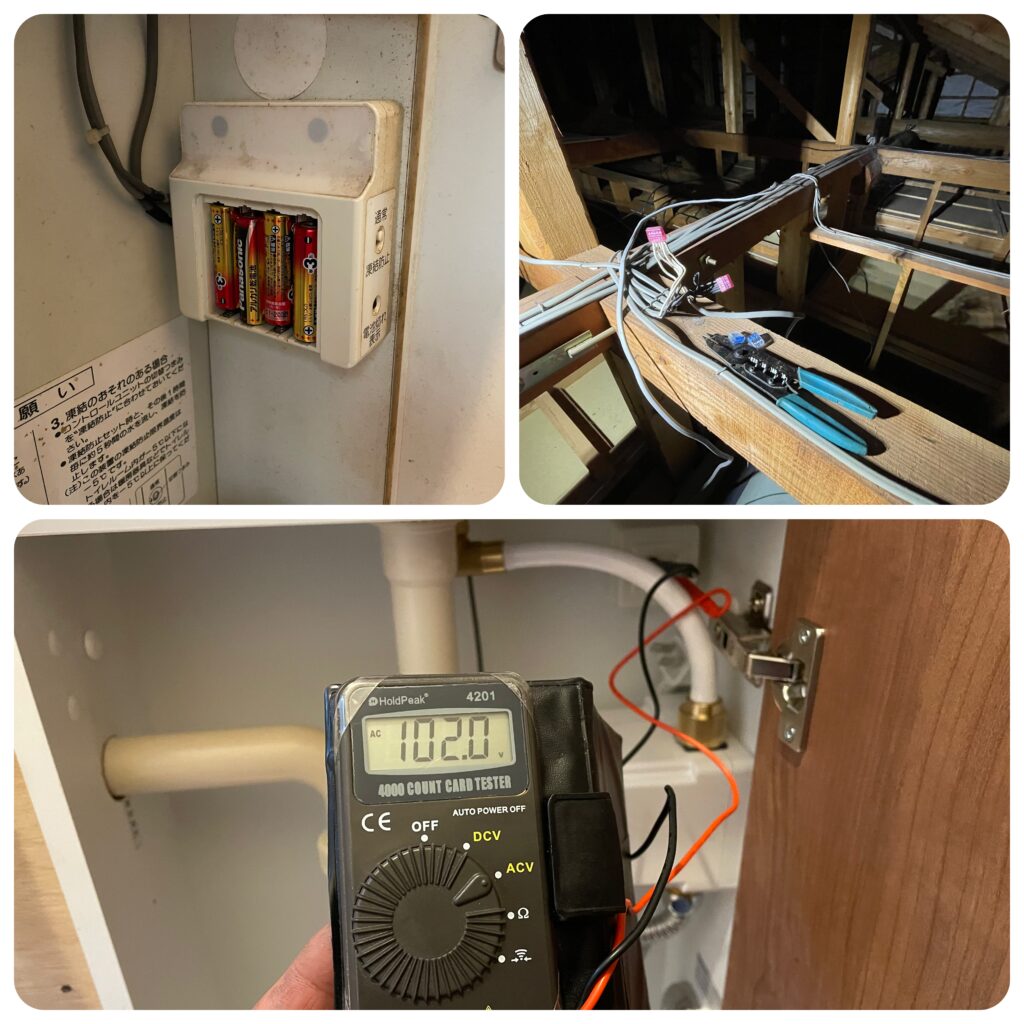 これまで自動水栓の電力は乾電池で賄っておりましたが、電池の交換が煩わしいので天井裏から電源を引っ張ってくることにしました。