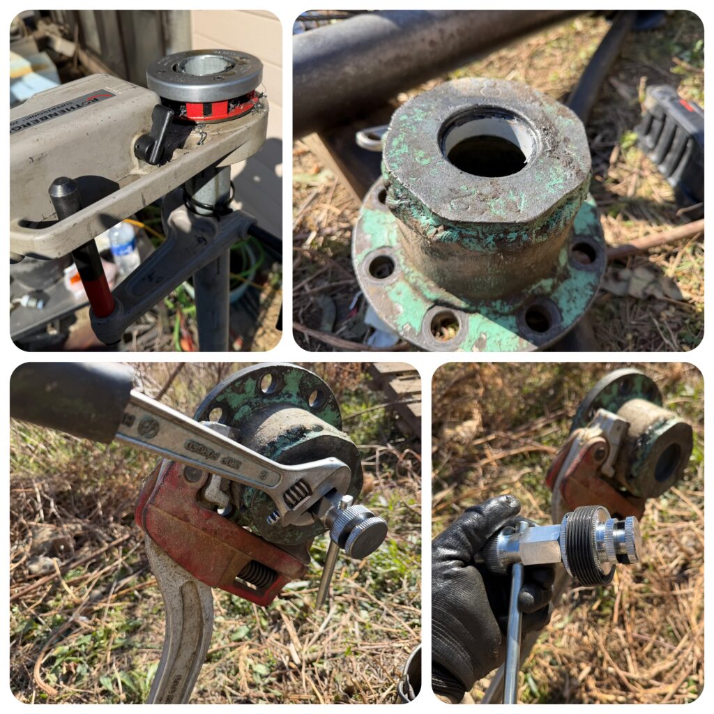 折れたネジは電動ネジ切り機で仕立て直し、破断したネジは専用工具で抜き取りました。