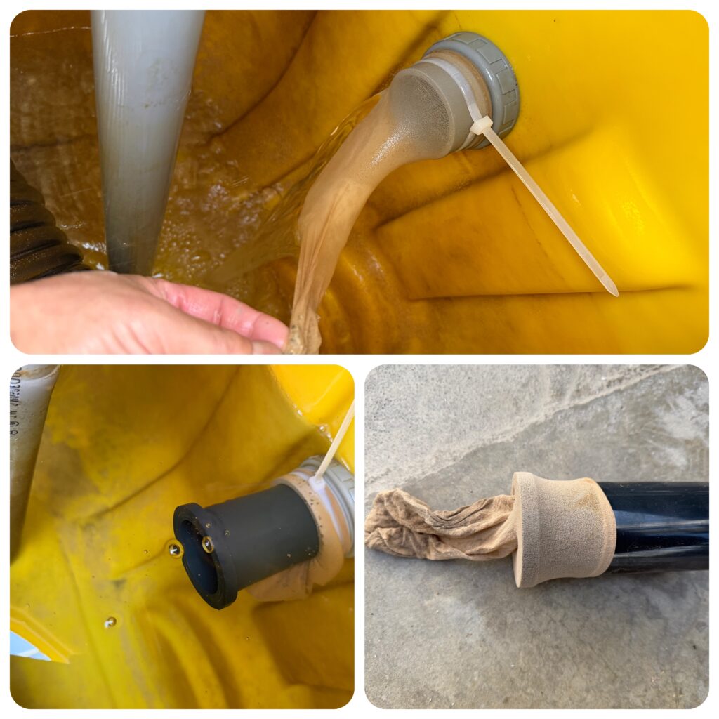 循環用貯水タンクに取り付けたゴミ取りストッキングと結束バンドが外れて、ポンプが吸い込みインペラに詰まらせていました。