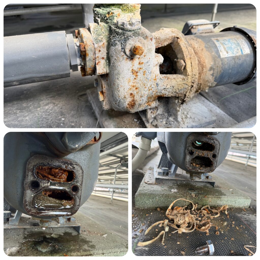 同時にそれが要因でシャフトに負荷がかかりメカニカルシールを傷ませて漏らしていたり、キャビテーションを起こして異音を発生させたりしていたのではないかと思われます。