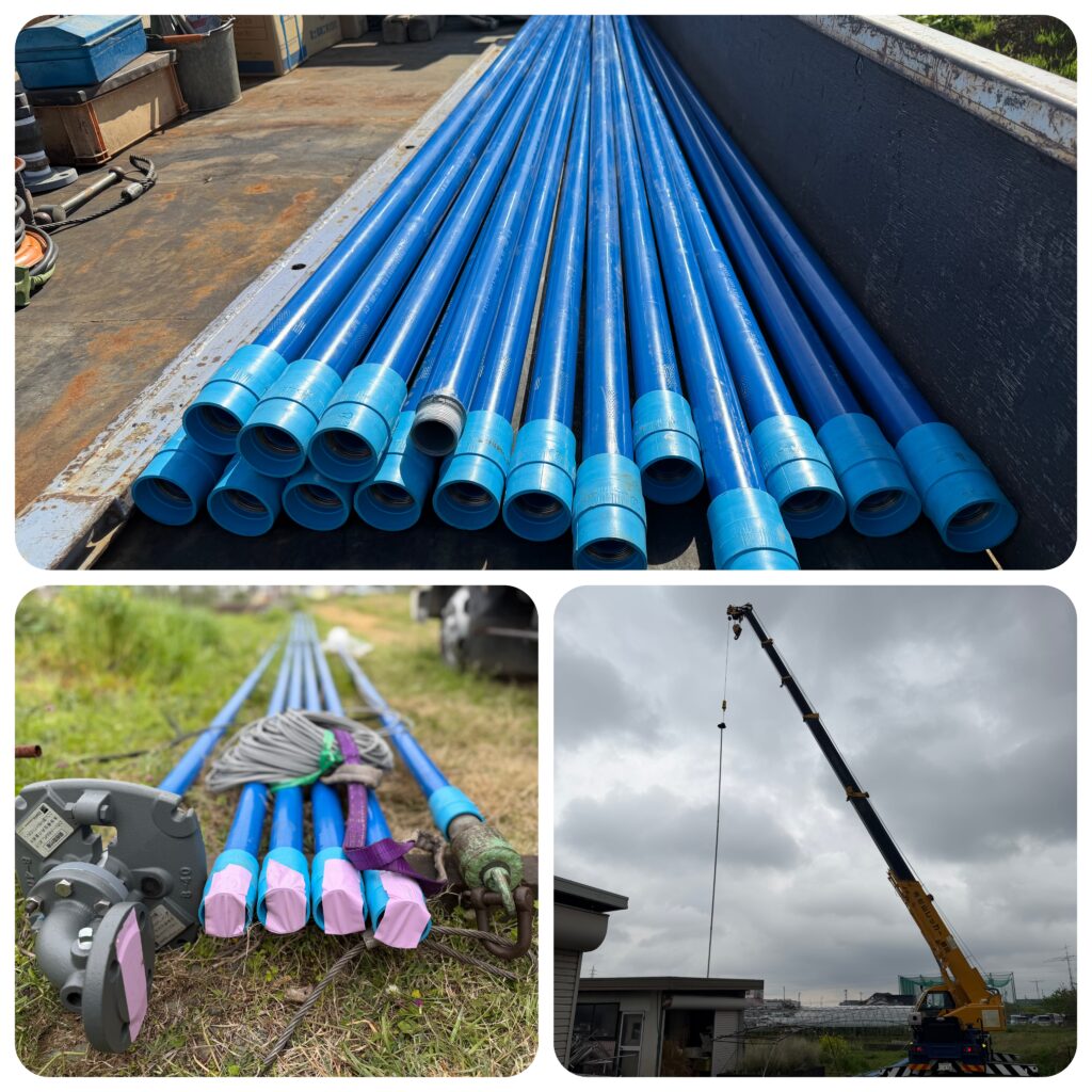 理想を言えばステンレスポンプなので繰り出し管もステンレス管が望ましいのですが、本数が多くて費用もかなり高額になってしまうことから内外面被覆鋼管を選定させていただきました。