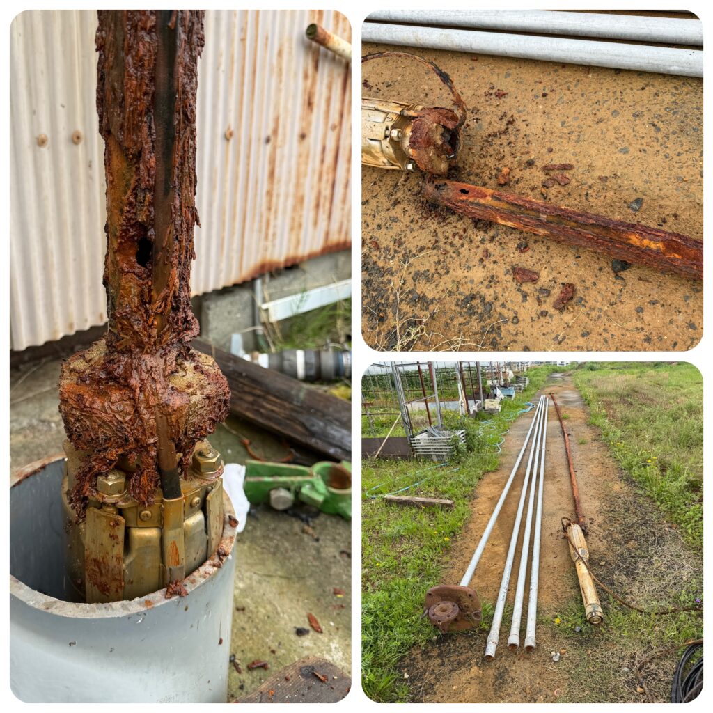 電圧、電流、絶縁抵抗値は正常でしたので電食による揚水管の穴開きを予想しました。